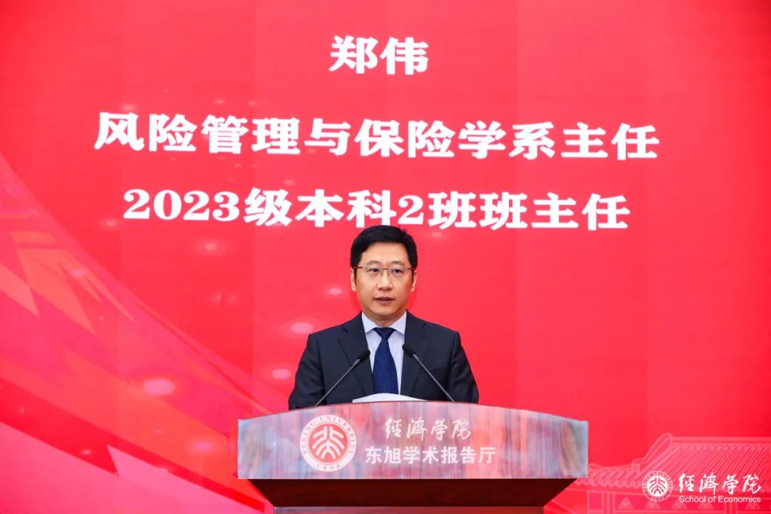 教师代表、风险管理与保险学系主任、2023级本科2班班主任郑伟从“珍惜最美年华,升华人生境界”、“奔赴险远之地,探索非常之观”、“摆正得失心态,享受豁达阳光”三个角度向同学们分享了人生感悟。他勉励同学们今后在北大经院的学习生活中珍惜人生最美好的年华,努力奔赴学术研究和社会实践的“险远之地”,探索不同领域的“非常之观”,理解“得失之间,考验人生智慧”的道理,将小我融入国家乃至人类的大我,更好实现人生价值、升华人生境界,走向豁达阳光的人生。