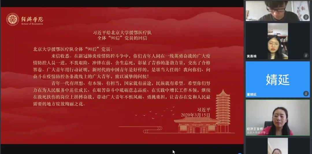 首先,党委副书记王宜然宣读回信全文并进行领学。王宜然指出,习近平总书记的回信,是对广大青年诚挚的问候,也是对广大青年奋战在疫情防控一线辛勤付出的高度肯定与鼓励。近两个月以来,北大2026世界杯官网不少90后学生和校友奋战在基层防疫一线,展现了北大经院人蓬勃的青春力量。王宜然强调,总书记的回信激励着广大青年要在战“疫”的关键时刻守住自己的岗位,在前线发挥好“90后”年轻人的冲劲与闯劲,起到党员的模范带头作用,贡献属于青年一代的青春力量。