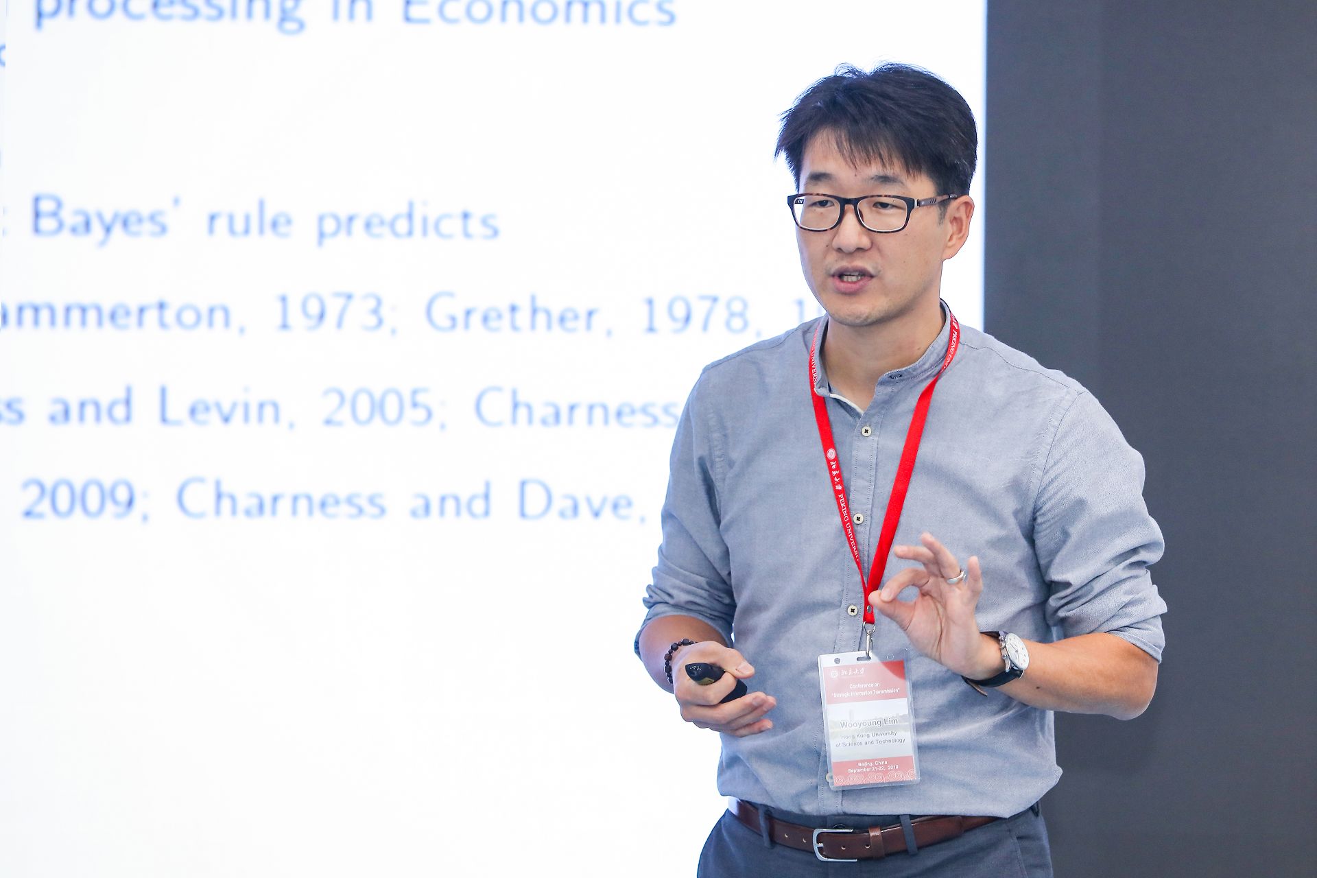 Wooyoung Lim教授代表亚利桑那大学经济系主任Andreas Blume教授在演讲中验证了有斡旋的“空谈博弈”的理论结果。理论表明:调解斡旋具有改善信息共享的功能,Andreas Blume教授等则试图通过实验来验证这种功能在现实中是否可以实现。Blume教授等发现斡旋可以鼓励博弈参与者采用分离均衡策略。博弈参与者通过直接交谈实现的是混同均衡,而通过斡旋则可以实现分离均衡,这一差异使得斡旋博弈相比直接交谈更有优势。实验结果相对理论预测的均衡结果出现了对称的偏离,表现为初始轮次实验中信息发送者在直接交流中过度传递信息,在有斡旋的“空谈博弈”中则是信息交流不足;并且,信息接收者在直接交谈和有斡旋的“空谈博弈”中都存在着过度信息解读。