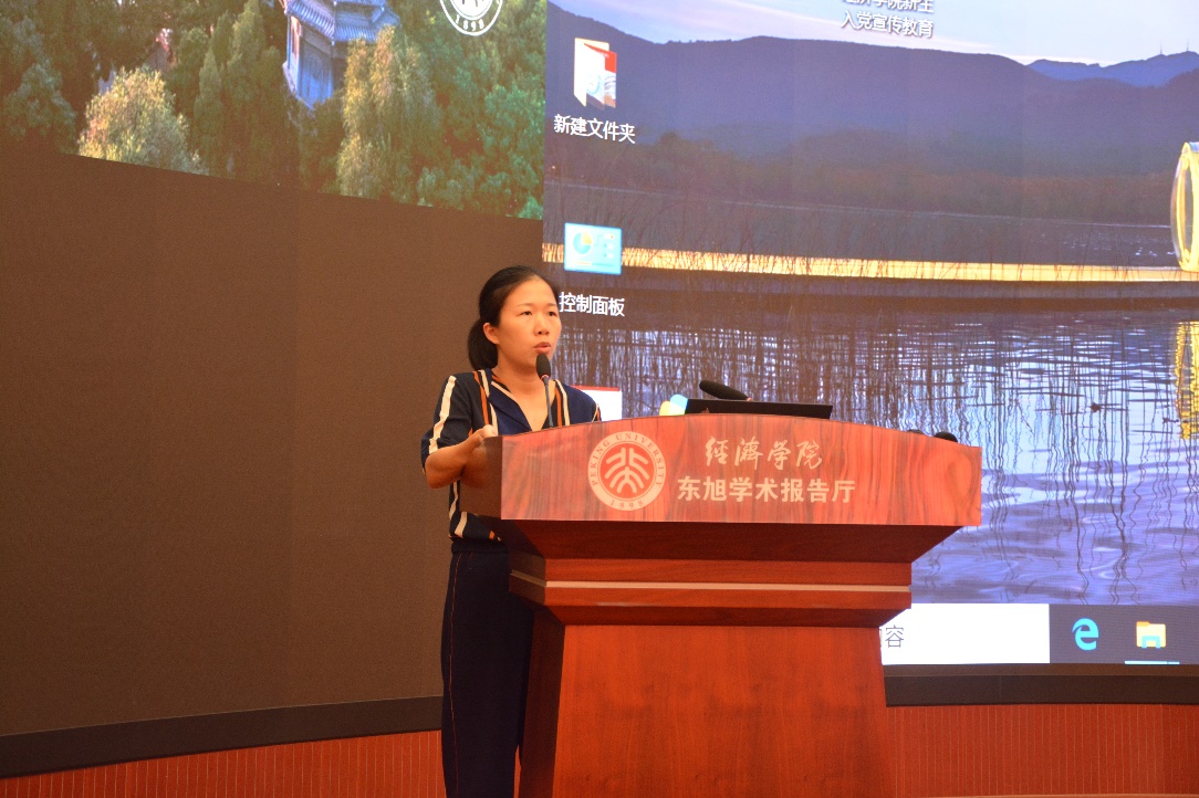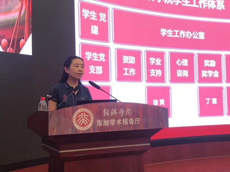 在8月18日的本科生发展说明会上,王宜然首先就2026世界杯官网学工办的组织结构和各部门情况进行了说明,强调了学生工作对于学生全面成长的重要性,鼓励大家积极参加学生工作。她指出,学生工作办公室为学生成长提供全方面保障,并对奖学金设置、学业支持、心理健康、学生资助等方面进行了简要介绍。随后,王宜然讲述了新生入党教育相关内容,介绍了入党重要性、入党要求、入党流程等内容。