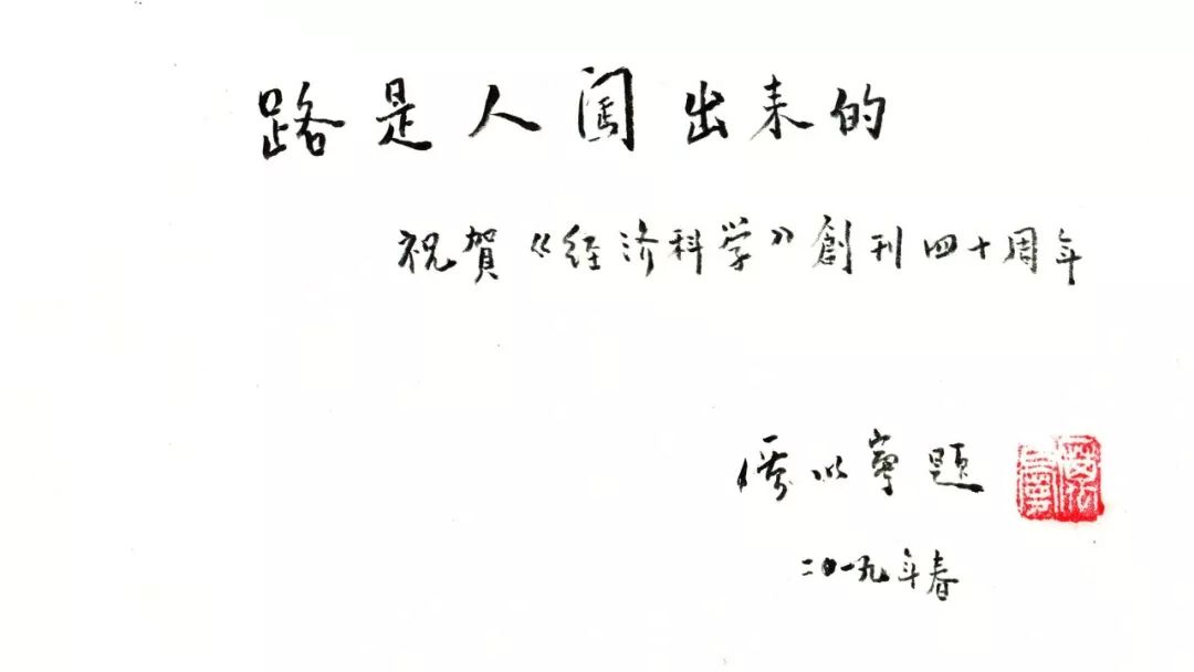在《经济科学》创刊40年之际,《经济科学》首任编委、“改革先锋”奖章获得者、年近90高龄的我国著名经济学家厉以宁教授欣然挥毫为本刊题词“路是人闯出来的”,这既是对《经济科学》多年来不断探索、勇于创新精神的概括与总结,也是对刊物未来发展的鞭策和期望。我们将一如既往发挥高水平学术期刊的传播、评价和引导功能,不断探索经济现象的深层原因,努力推动新时代经济学研究的进一步发展。