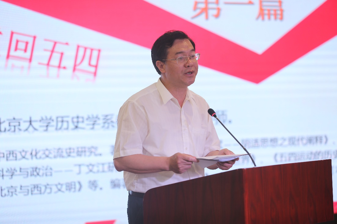 在“穿越百年,重回五四”环节中,欧阳哲生教授介绍了五四运动的爆发过程、五四青年的思想主张以及五四运动的历史意义,概括讲述了现当代历史学界对五四运动的研究状况,并指出“五四运动是现代性在中国成长的标志性事件,是中国从传统向现代转型的助推器”。欧阳哲生的讲述深入浅出,全面回顾了这一重大的历史事件。他重点阐释了五四运动的爱国意义,赢得了在场青年们的热烈掌声。