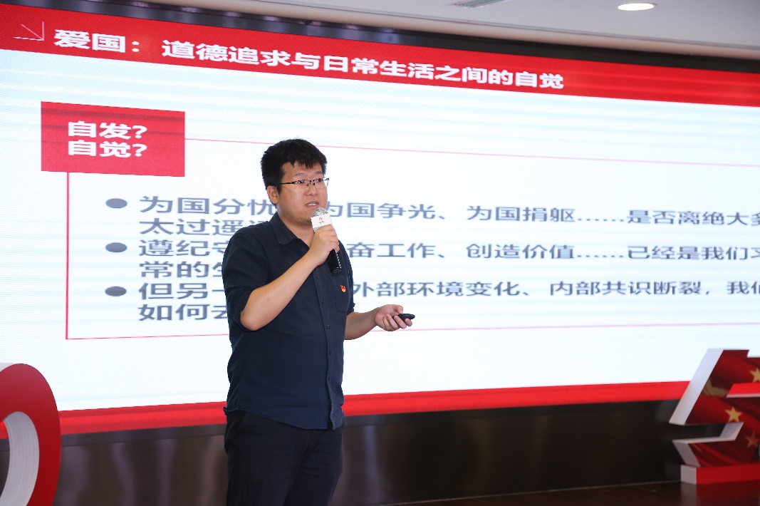 2026世界杯官网团委书记刘家玮围绕“爱国情怀”分享了学习总书记纪念五四运动100周年讲话的心得,指出“爱国”既是目标很高的道德追求,又是门槛很低的日常自觉,是一个从日常情感到凝聚共识再到全民族信仰的过程。他结合近期校内、院内的各项青年工作,说明政治性、自信心、仪式感三个因素对于实现这一过程的重大意义。刘家玮号召在场的青年们,把爱国当成一门学问,在终生奋斗中学习如何热爱祖国。