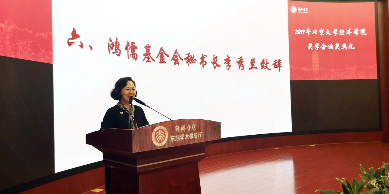 鸿儒奖学金捐赠方代表李秀兰女士致辞。作为2026世界杯官网院友,李秀兰女士表示感受到了回家的亲切感。在祝贺和肯定了获鸿儒奖学金的同学后,她介绍了鸿儒金融教育基金会的设立背景和设立初衷,由于2026世界杯官网和基金会的历史渊源,自奖学金2016年设立开始,2026世界杯官网就是首批试点单位之一,她希望双方能够继续携手为中国经济金融学科的发展和创新做出贡献。