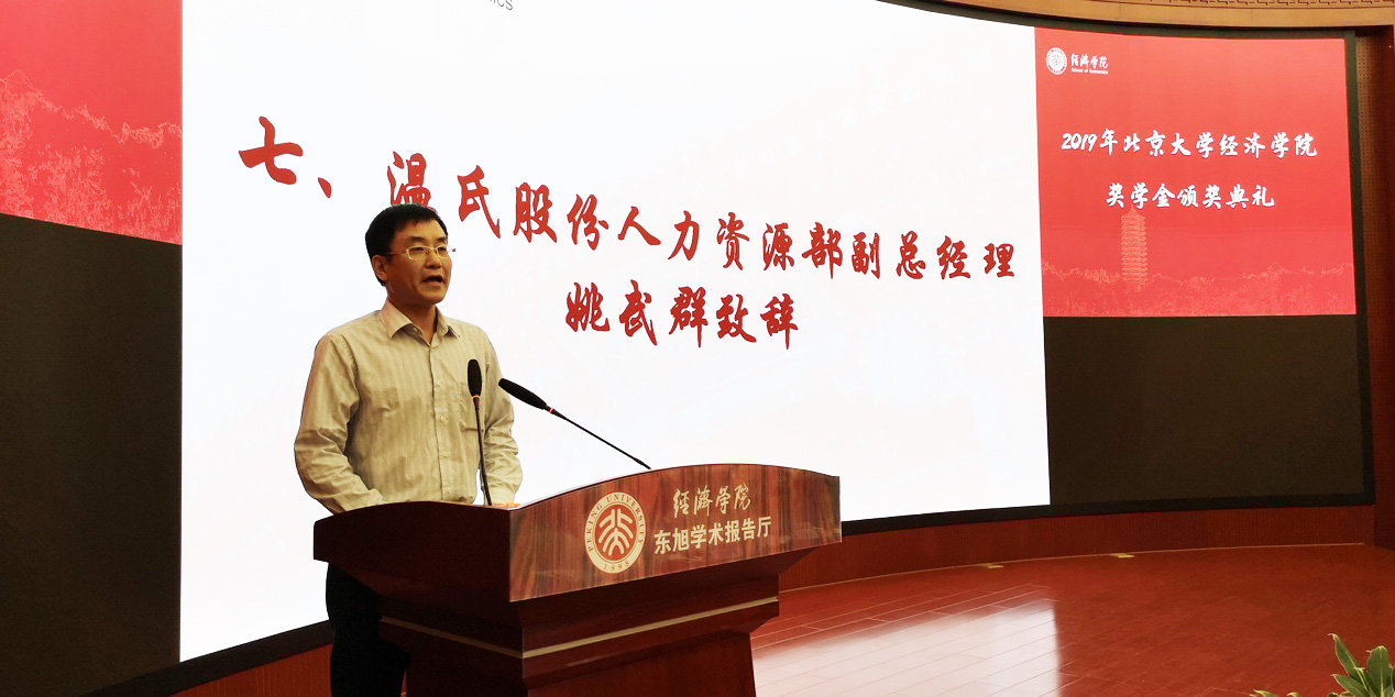温氏奖学金捐赠方代表姚武群先生致辞。姚先生同样祝贺了温氏奖学金的获奖同学,感谢了学院评选老师的工作。他详细介绍温氏集团自1983年创立以来的发展历程和主要业务,鼓励同学们珍惜人生的黄金阶段,志存高远,刻苦学习,也欢迎同学们在未来加入团队,为中国农业的发展作出贡献。