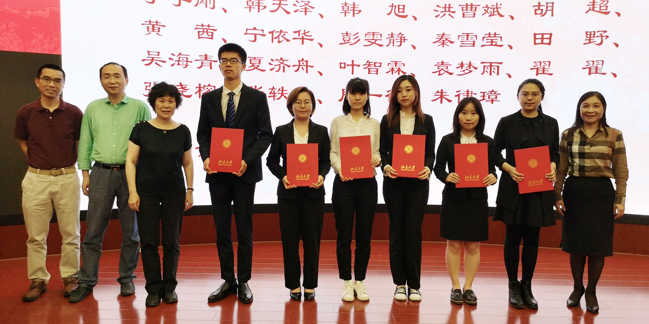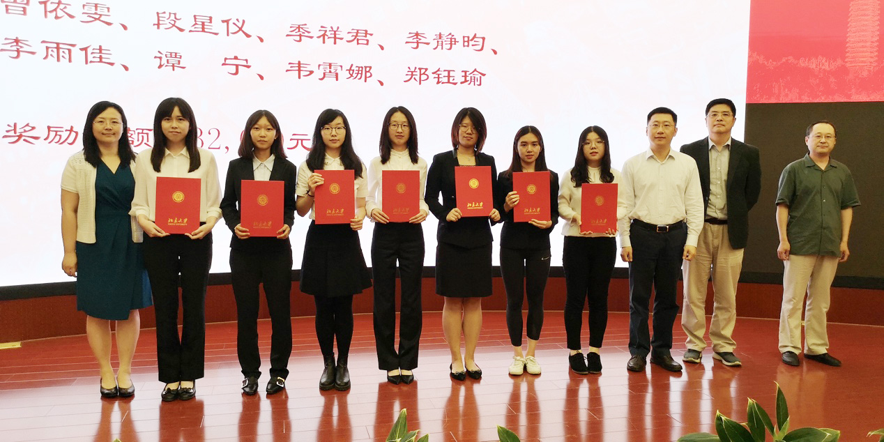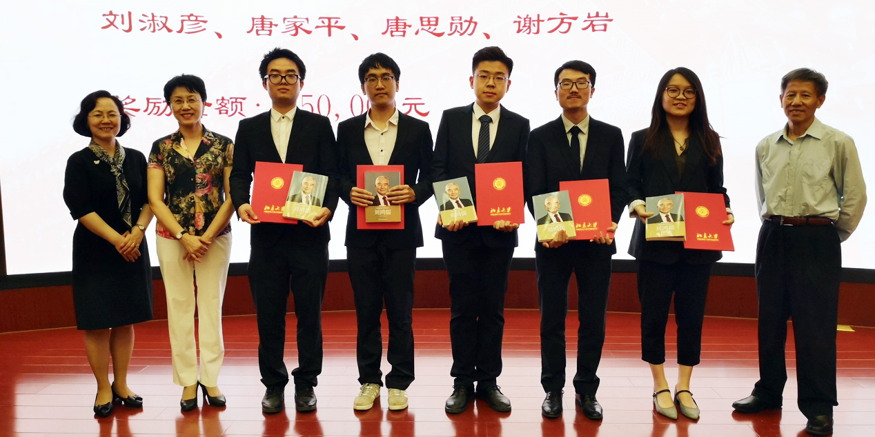 紧接着进入颁奖环节。鸿儒奖学金、温氏奖学金、山东绿地泉奖学金、美仪奖学金和启航奖学金的获奖同学分别上台,由李秀兰、姚武群、李庆云、孙祁祥、王跃生等捐赠方代表和老师们为其颁奖。
