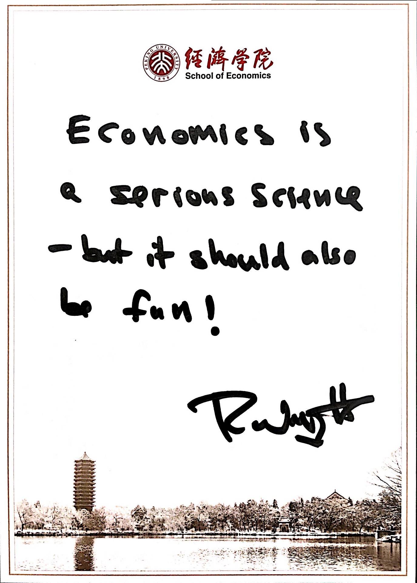 兰德尔·莱特教授手写留言(翻译):经济学是一门严肃的学科,但它也应该是有趣的!