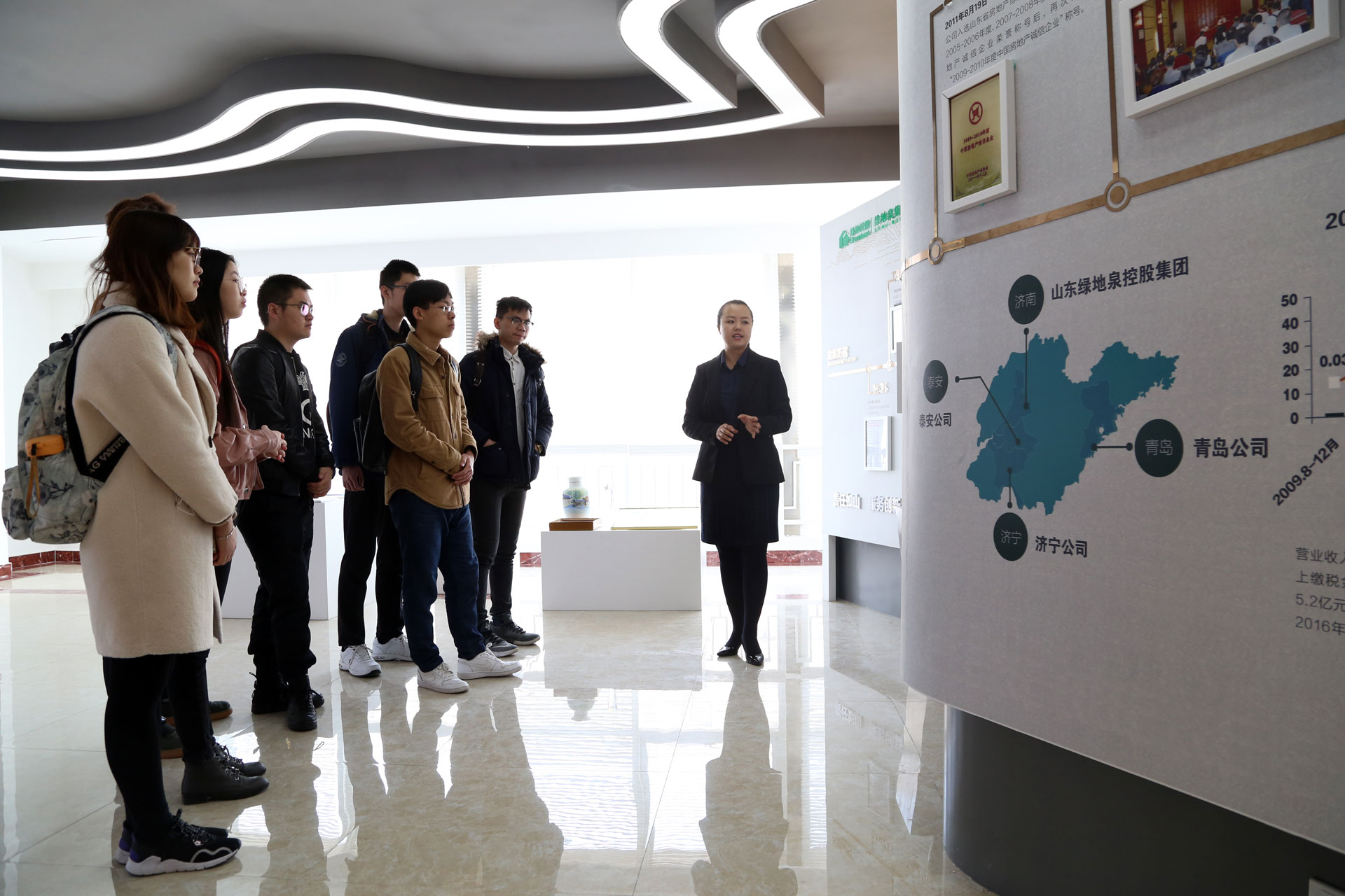 3月8日上午,校外导师刘岷对同学们的到来表示热烈欢迎,研究生宫博代表同学们感谢各位领导的亲切接待。公司人员为学生介绍了集团的发展历程,集团前身自1975年设立以来扎根山东、稳步发展,特别是2009年转企改制以来,集团综合实力、经营业绩和品牌影响力快速提升,营业收入从2008年2.51亿增长为2018年超过110亿,资产总额较改制前增长超20倍。随后,在集团传统文化推进中心,同学们观看了“敬天祈福”文化宣传片,深刻感受到山东绿地泉致力于为广大传统文化爱好者及社会各界创建一个交流、分享、共同成长的文化家园,在推动传统文化落地方面做出贡献。