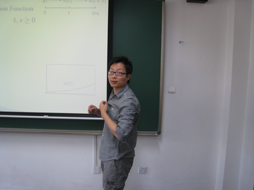 2011年6月2日,第64次“北大赛瑟(CCISSR)双周讨论会”在三教306举行,美国威斯康星大学密尔沃基分校助理教授冯润桓博士做了题为“随机年金:分析股票连结投资保障的新方法”的讲座。风险管理与保险学系的部分老师和本学期选修《保险精算学原理》课程的同学们参加了此次讲座。陈凯老师主持了此次讲座。