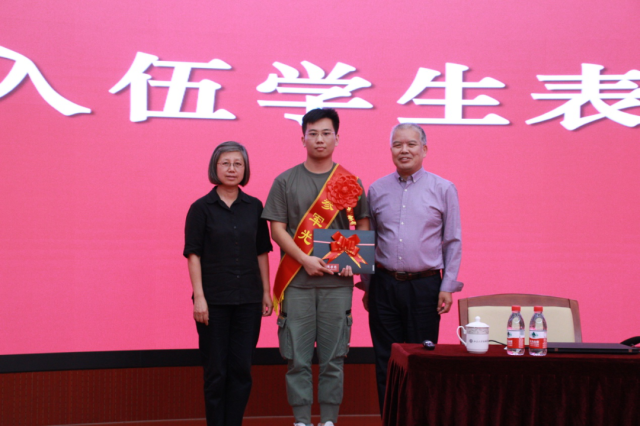 表彰仪式在雄壮的进行曲中展开,崔建华书记代表学院为巴云昊赠送礼物,勉励巴云昊同学不忘初心、入伍后磨砺自我、报效祖国。