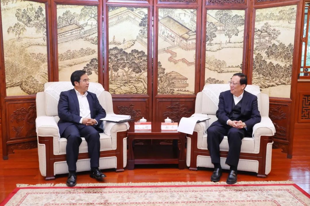 郝平在临湖轩中厅会见刘连舸一行,双方就欧盟经济与战略研究中心的发展、推进校企合作等进行交流。