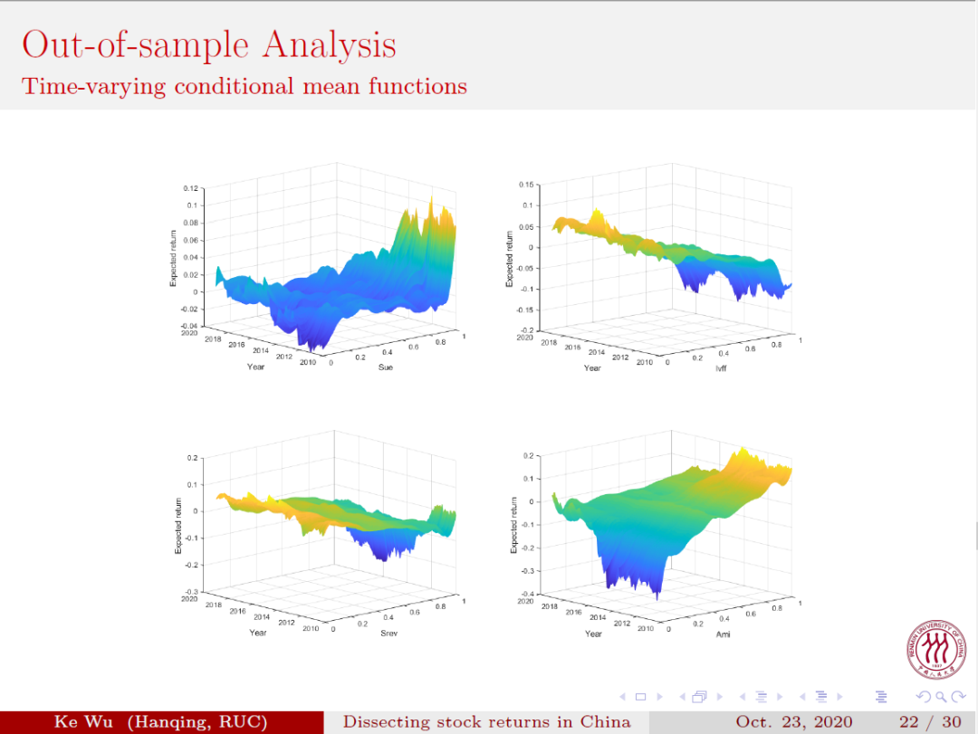 吴轲副教授的报告研究了哪些特征为中国股票市场的预期收益率提供了增量预测信息。这篇论文提供了预期收益率和选定特征之间的强非线性关系的证据。通过全样本分析,论文筛选出了16个可以提供独立信息的变量。之后通过样本外的预测,进一步筛选出了在中国股票市场能提供独立信息的6个变量:standardized unexpected earnings(标准化的非预期收益),idiosyncratic volatility(特质波动),short-term reversal(短期反转),Amihud’s illiquidity measure(Amihud非流动性指标),the Dimson beta(Dimson贝塔),earnings-to-price(市盈率)。通过这6个变量构建的样本外非线性预测取得了比线性模型更高的夏普比率。