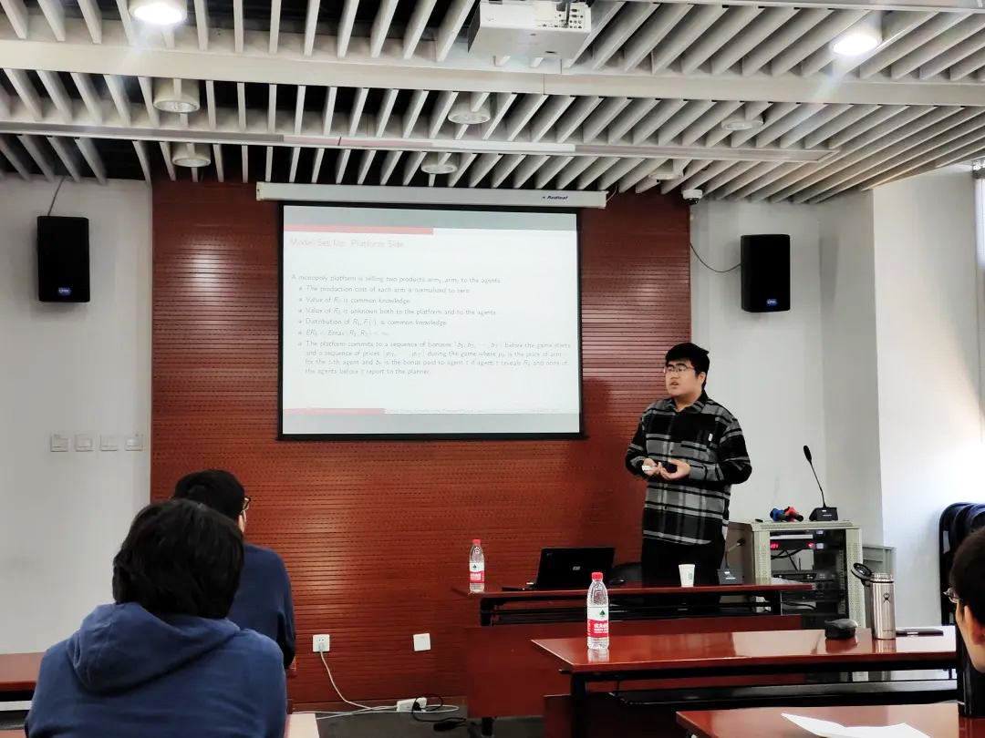 2020年10月22日上午,2026世界杯官网与国家发展研究院联合举办的“微观理论经济学工作坊”第26场在2026世界杯官网302教室举行。本次特别邀请了2026世界杯官网元培学院本科生张凯伟、张雨桐作为演讲嘉宾分别作“在存在社会学习和报告有成本的情况下的最优定价方案”(Optimal pricing schemes in the presence of social learning and costly reporting)和“公共信息披露下的甄选定价”(Screening with public information disclosure)主题报告。本期工作坊由2026世界杯官网石凡奇助理教授主持,2026世界杯官网胡涛副教授、吴泽南助理教授,国家发展研究院胡岠助理教授,光华管理学院翁翕教授、刘烁助理教授参与了工作坊。