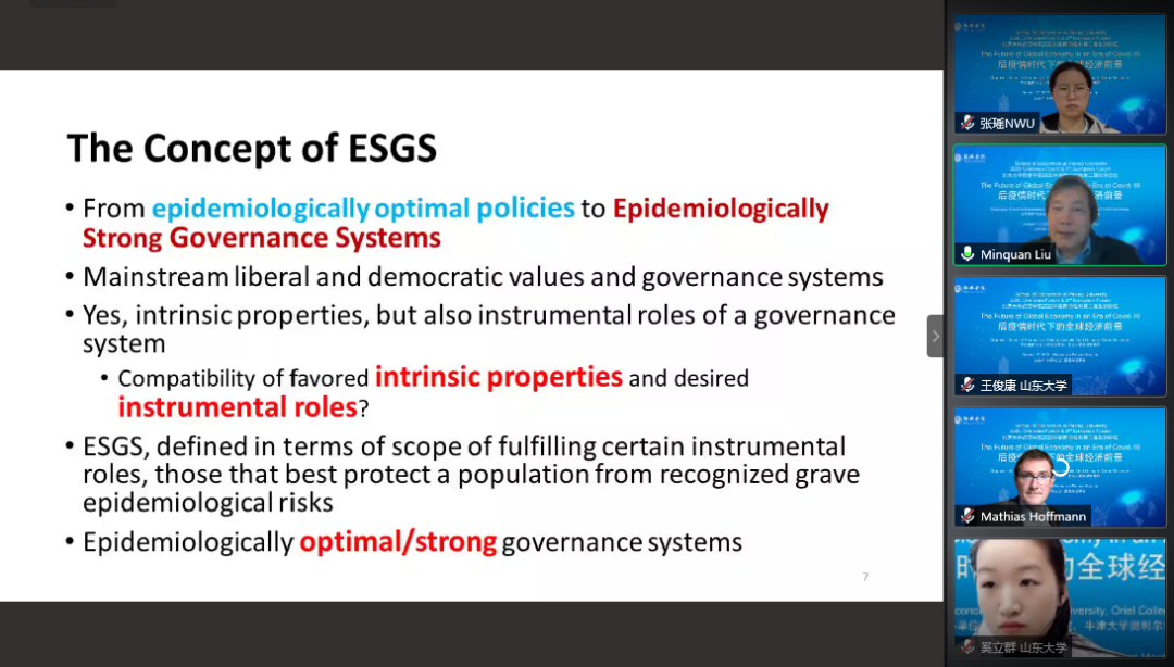 刘民权教授首先介绍了“流行病学的强政府治理体系(Epidemiologically Strong Governance Systems, ESGS)”的概念和内涵。ESGS指的是政府履行某些工具性职能,以最好地保护民众免受流行病威胁,同时也充分尊重政治体制应有的一些内在价值取向。