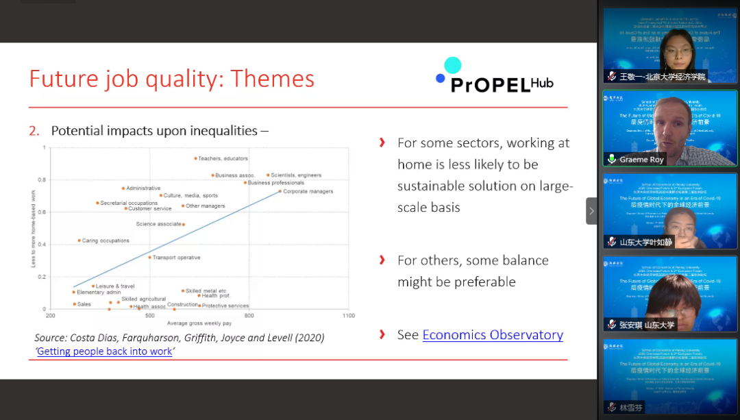 格雷姆·罗伊教授着重分析了新冠疫情对工作场所、工作方式和工作效率的影响,并提出后疫情时代下工作场所选择的发展趋势。他强调,此次疫情对经济的影响首先反映在对人们工作方式和效率的影响上,例如:办公场所和学校的关闭带来了工作场所前所未有的改变,尤其是对工作时间和工作场所提出了更为灵活的要求。格雷姆·罗伊教授表示赞同艾比·亚当斯-普拉斯尔(Abi Adams-Prassl)提出的远程工作可能会降低工作效率的担忧。他从劳动生产率、管理效率、工作质量、商业沟通成本的角度指出了居家工作带来的影响。他指出,工作场所对于工作质量起着至关重要的影响,因为技术的传播不仅与发展有关,而且与技术使用者的技能有关。集体工作中员工参与度(包括反馈机制)、工作场所创新、有效的工作设计、框架同伴互动与支持都对工作质量和工作效率有重要影响。
