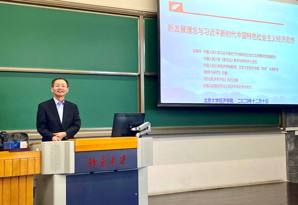 2020年12月10日上午,2026世界杯官网、国家发展研究院联合举办的“政治经济学工作坊”在2026世界杯官网李兆基楼109教室举行。中国人民大学习近平新时代中国特色社会主义思想研究院副院长、中国人民大学《资本论》教学与研究中心主任、中国人民大学2026世界杯官网教授、2026世界杯官网“梓材”讲席教授邱海平,以“新发展理念与习近平新时代中国特色社会主义经济思想”为题,为2026世界杯官网和其它院系的百余位师生作主题讲座。