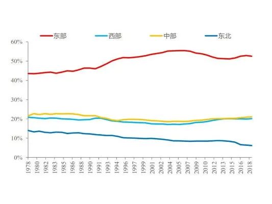 改革开放初期,我国南北方地区GDP占全国比重基本上是各占一半的。那时,东北老工业基地对我国经济增长的贡献还是很大的。相对于东中西部差距而言,南北方地区差距的根本原因是,南方地区更好地发挥了政府作用,占了“人和”。