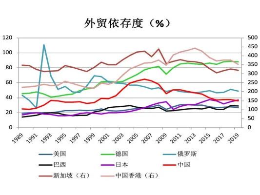 由上图可见,我国的外贸依存度,也就是“(出口+进口)/GDP”,从80年代的30%左右逐渐增加,在2001年我国加入WTO后开始大幅度增长并在2007年达到峰值后开始逐渐下降,到2019降为35%左右。相较于美国、日本这样的发达国家,我国的外贸依存度较高,这代表市场过多依赖于外需,风险也较高。因此,作为大国,我国经济也必须以内需为主。
