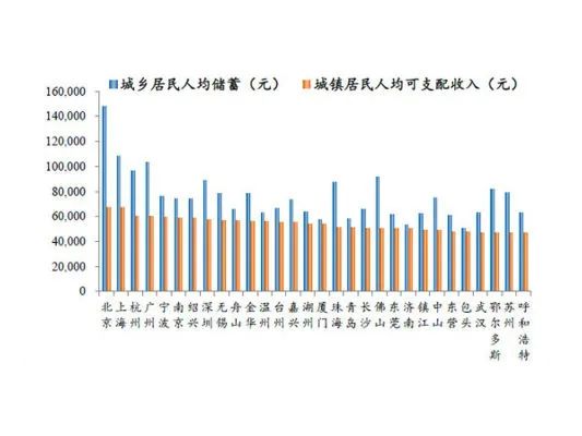 由上图可见,在城乡人均储蓄方面,北京最高,其后大多都是南方城市,如上海、杭州、广州、宁波、南京、绍兴、深圳、无锡、舟山等。