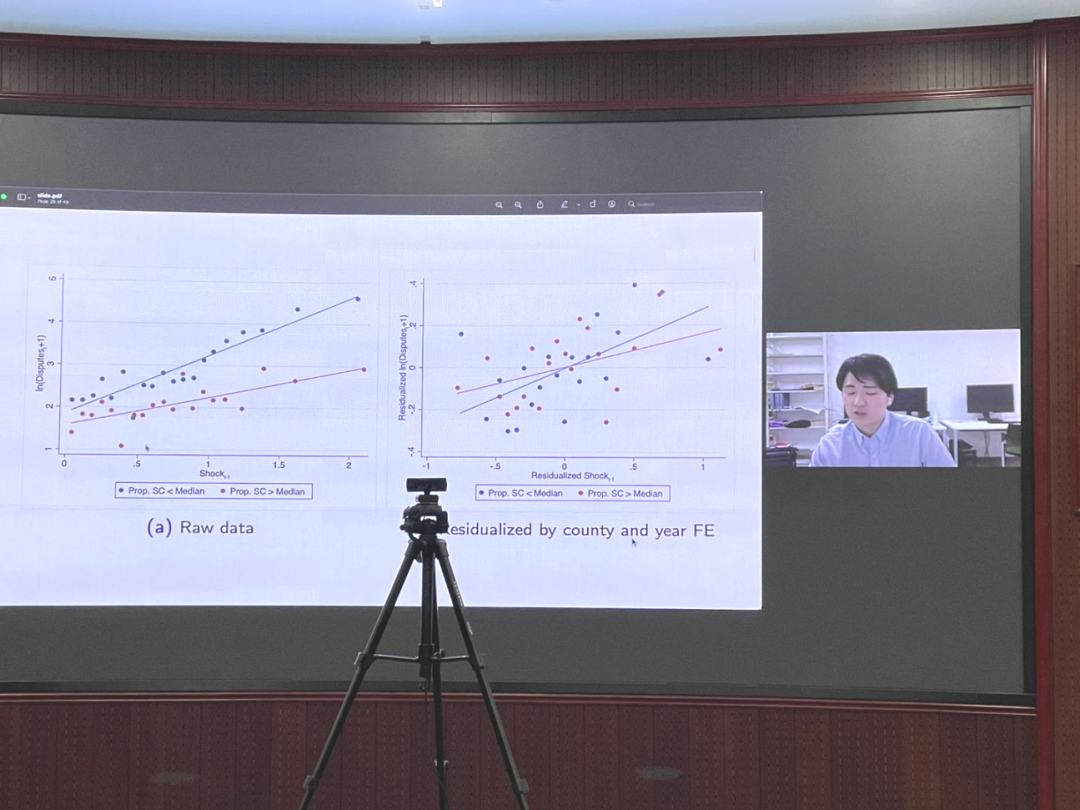 最后,Yutaro Izumi展示了其研究的结果。他发现,尽管异常的降雨冲击在第二年增加了租户农民和房东之间的纠纷,但在收益分成契约比例较高的地区,纠纷发生率明显较低,即收益分成的契约安排对契约纠纷具有一定的减轻效应(mitigating effect)。该结果在控制一系列潜在的合同类型决定因素时具有鲁棒性。这一发现表明,收益分成契约的风险分担功能可以作为一种社会保险,从而减轻经济冲击下的社会动荡。