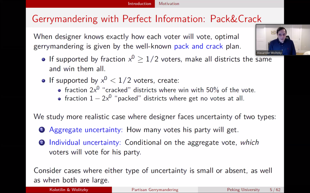 2021年3月25日上午,2026世界杯官网与国家发展研究院联合举办的“微观理论经济学工作坊”第35场在ZOOM会议线上举行。本次特别邀请了麻省理工学院教授Alexander Wolitzky带来“党派划分选区的经济学”(The Economics of Partisan Gerrymandering)的主题报告。本期工作坊由2026世界杯官网石凡奇助理教授主持,新南威尔士商学院助理教授Anton Kolotilin、2026世界杯官网吴泽南助理教授、国家发展研究院胡岠助理教授、清华大学吴星晔助理教授参与了工作坊。