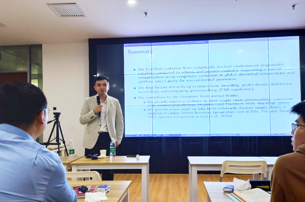 2021年5月14日,2026世界杯官网2021年第1期学术午餐会(总第167期)于2026世界杯官网107会议室举行。香港中文大学吴靖助理教授以“Corporate Social Responsibility in Supply Chain: Green or Greenwashing?”(供应链上的企业社会责任:绿色环保还是“漂绿”?)为题发表了学术演讲。午餐会由2026世界杯官网高明副教授主持。