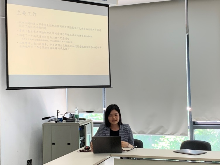 最后,2017级博士生周心怡报告了同财政学系蒋云赟副教授合作、已发表于《财政研究》杂志的论文《我国基本医疗卫生服务均等化的研究——基于财政支出与效率的视角》。本文从地区间的收入不平等差距和地区间养老保险收支余缺差距两个角度探讨了地区不平衡问题,构建了一个两代异质性行为人世代交叠模型,考虑了基本养老保险制度改革对劳动力跨地区流动的影响机制、中央和省两级政府结构以及中央调剂金上解和下拨过程,从缴费率、实际征缴率、中央调剂金上解比例和拨付分配政策四个方面进行数值模拟,研究了养老保险全国统筹的政策效应。研究发现:第一,仅通过各省级地方政府改革本辖区内养老保险缴费率,不会影响当前人口流向发达地区的总体趋势,无法有效改善地区不平衡的状况;第二,随着中央调剂金对落后地区拨付倾斜度更高,居民逐渐倾向于“回迁养老”,但相对落后省份收不抵支情况加剧,地区间基金收支余缺差距变大;第三,随着中央调剂金上解比例提高,因发达地区向中央上解数额更大、养老金水平下降,居民同样倾向于“回迁养老”,地区间收入不平等差距和养老保险基金收支余额差距都将得到改善。