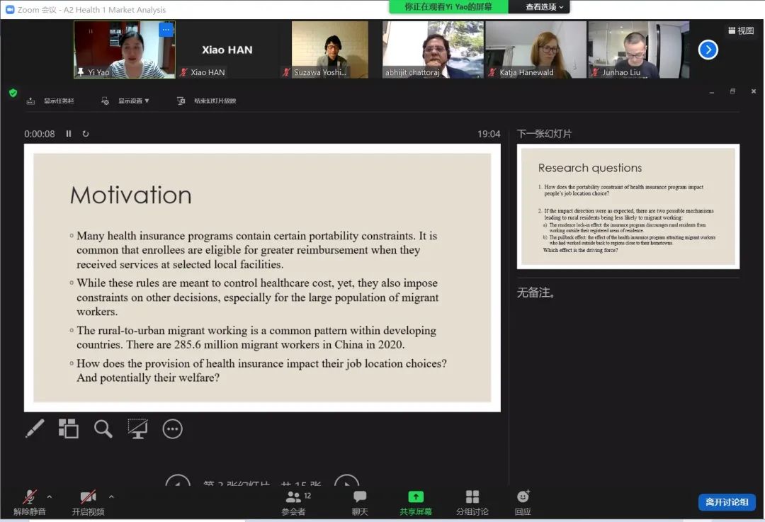在学术分论坛上,郑伟受邀担任“养老金/社会保险/员工福利”分论坛的主持人,姚奕受邀担任“市场/文化/产品分析(健康险)”分论坛的主持人。在分论坛上,姚奕宣讲了工作论文《健康保险对工作地点选择的影响:来自中国农村的证据》(合作者:王乙杰、孙文凯、石菊)。在“养老金/社会保险/员工福利”分论坛上,韩笑宣讲了工作论文《长期护理保险对配偶劳动供给的溢出效应》(合作者:郑伟、刘子宁)。此外,姚奕、韩笑也担任了分论坛点评人。