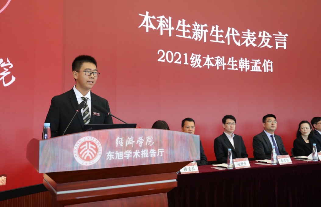 研究生新生代表秦范发言。她谈到,在未来的学习生活中要坚守心之所向,坚定“以科学为天职、以学术为使命”的追求;扎根中国大地,研究中国问题,讲好中国故事,尊重与倾听每个微观个体,关注他们的生活现状与命运,了解真实世界中的经济运行逻辑;勇担时代使命,将小我融入大我,将个人奋斗融入民族复兴伟业,传承北大经院的荣光,肩负时代青年的使命,在砥砺奋进的道路上行稳致远。