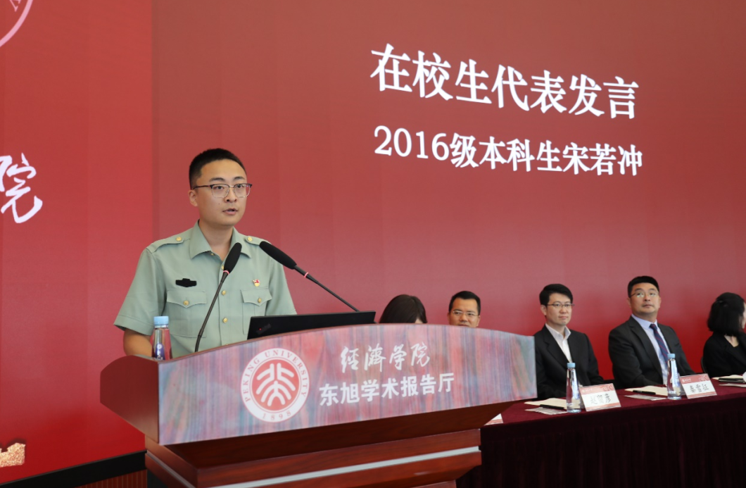 2016级本科生宋若冲作为在校生代表发言。他服役于战略支援部队南京市某部,刚刚退伍返校继续本科学业。宋若冲结合参军、实践经历分享了自己的体会,鼓励大家走出舒适区,在不同领域的探索与尝试中,笃定地迈出每一步,找准自己的方向;勇当奋斗者,传承好经院的历史和文化,做一个对党和人民有贡献的人,让理想在人民的事业中扬帆远航。