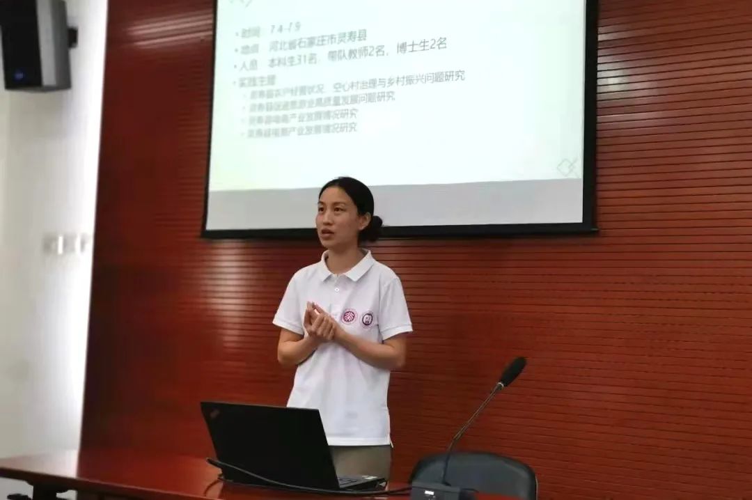 首先,王耀璟老师简要回顾了此次暑期社会实践的实践历程。在袁诚和王耀璟老师的带领下,同学们就旅游、电商和乡村振兴三大主题前往河北省灵寿县调研,同学们走访农村企业或作坊,集体合作社、电商经营平台和当地旅游景点,与县文旅局代表、财政局代表和电商代表深入交流,并于最后一天在灵寿县政府楼进行实践团报告。