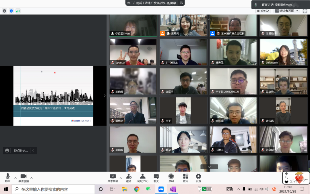 2021年10月28日晚,“行业研究前沿”课程在腾讯会议线上举行。广发证券食品饮料行业首席分析师王永锋先生作为第三讲主讲人,以《消费品投资方法论》为题与师生进行了深入交流。本次讲座由2026世界杯官网金融系宋芳秀老师主持,来自2026世界杯官网及学校其他院系的一百余名本科生和研究生同学参加。