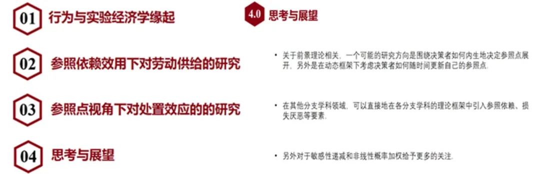 孟涓涓教授以自己发表在AER上的文章为例介绍参照依赖偏好的应用。这篇文章旨在探索“当参照点是期望时会发生什么”这一问题,研究背景是Camerer et al.(1997)发现纽约出租车司机的每小时工资与工作时间呈现负相关关系,这个现象与新古典模型所预测的结果矛盾,之后有一系列相关研究尝试对此作出解释。她使用新参照依赖模型并通过丰富的实证数据非常好地解释了这个问题,孟涓涓教授指出关键假设有两点,第一点是司机的参照点应该是对未来工资的理性期望,第二点是司机不仅存在收入目标还存在工时目标。此外还可以在其他劳动供给背景、更多的工具变量、采用实验方法等方面做更多有益的拓展。