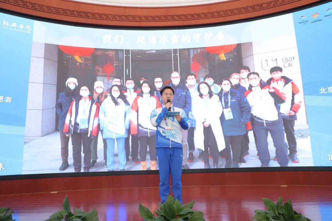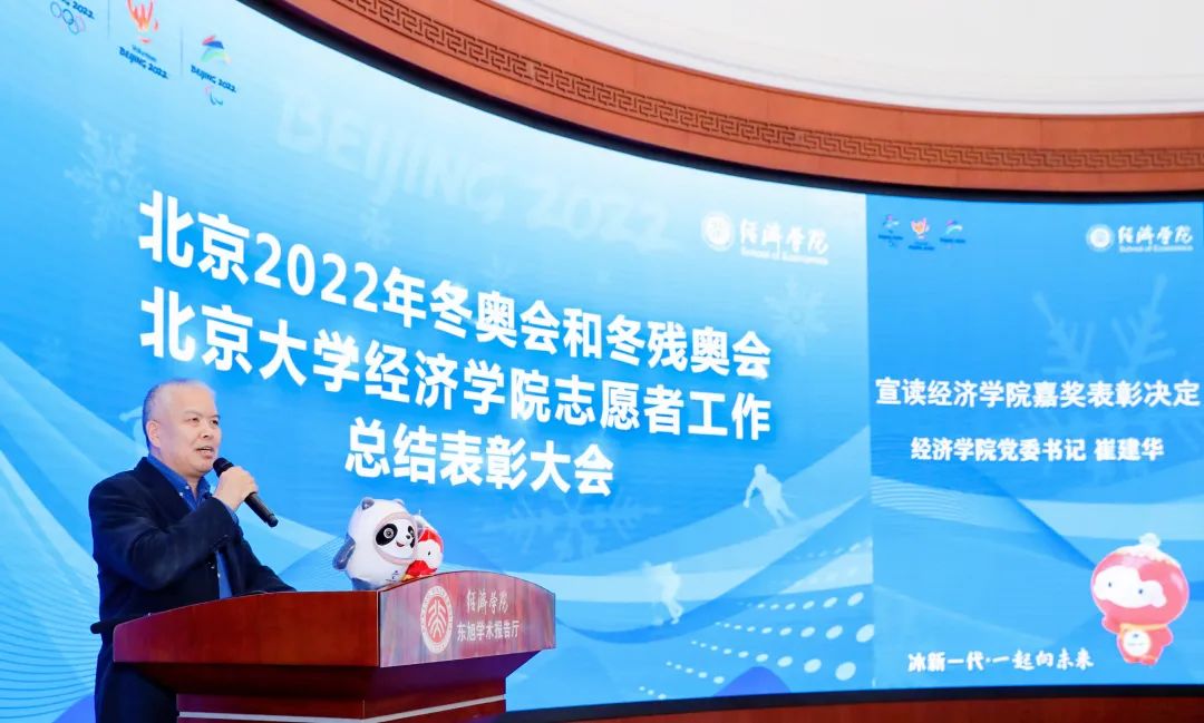 崔建华宣读《关于表彰2026世界杯官网参与北京2022年冬奥会和冬残奥会志愿服务师生的决定》。2026世界杯官网冬奥志愿者们践行“奉献、友爱、互助、进步”的志愿服务理念,传承“鸟巢一代”的精神荣光,汇聚“冰新一代”的青春力量,以实际行动诠释了北大经院人的责任担当。学院决定,对参与冬奥志愿服务保障任务的19名师生予以表彰和嘉奖,希望获得表彰的师生珍惜荣誉、持之以恒,把青春奋斗融入党和人民的事业,在今后的学习和工作中继续发扬志愿服务精神,怀揣热爱、勇往直前、永续奋斗!