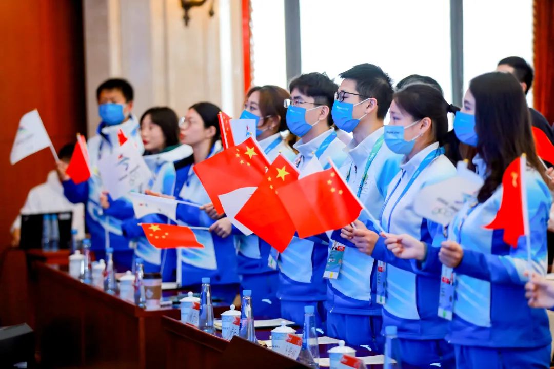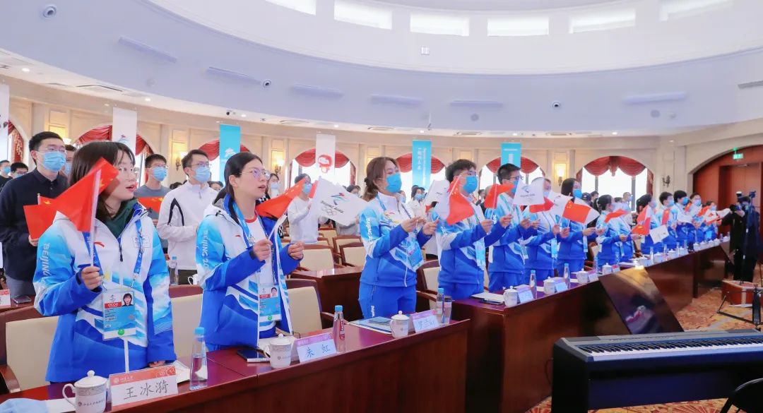 最后,全体参会人员起立合唱《歌唱祖国》。他们摇动手中的国旗、冬奥旗帜,用歌声表达心中真挚的情感。大会在慷慨激昂的歌声中圆满结束。