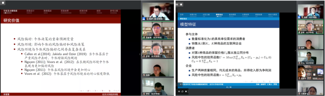 李紫繁基于随机酬金实验,研究了实际风险环境对个体风险偏好、时间偏好和乐观程度的影响和机制。评委专家和报告人在实验设计、研究数据选择、风险偏好和风险认知能力区别等方面展开讨论。
