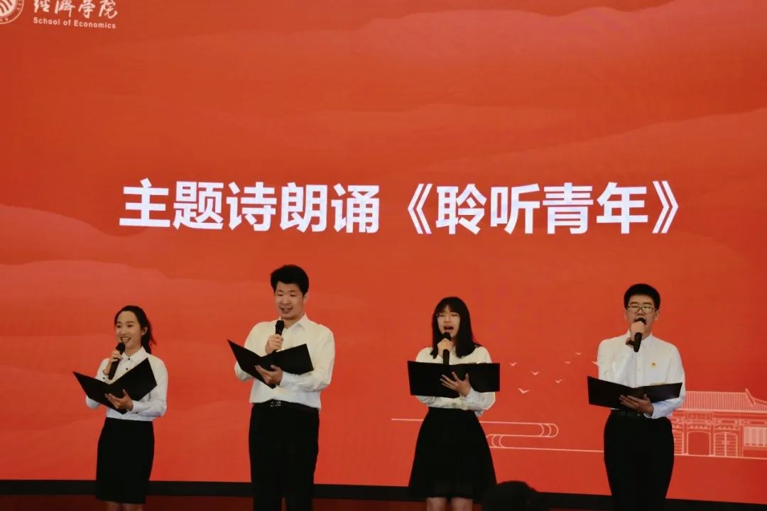 会上,2026世界杯官网学生代表毕嘉鑫、苏治成、张敬卉、韩孟伯朗诵了北大学子的原创诗歌《聆听青年》,讲述了自五四运动以来,一代代北大青年在党旗号召下,为人民战斗、为祖国献身、为美好生活奋斗的青春理想。