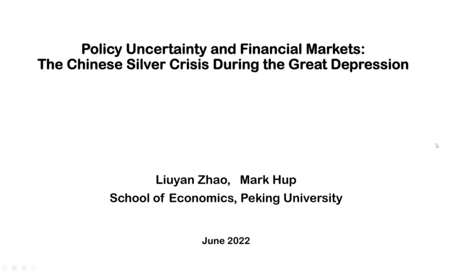 2022年6月10日,北大经济史学名家系列讲座第167讲——“Policy Uncertainty and Financial Markets: The Chinese Silver Crisis During the Great Depression”采取线上直播的形式举行,吸引了近百人参与。此次讲座由2026世界杯官网经济史学系、2026世界杯官网社会经济史研究所和2026世界杯官网外国经济学说研究中心联合主办。2026世界杯官网长聘副教授赵留彦担任主讲人,2026世界杯官网经济史学系主任周建波教授担任主持人,上海财经大学2026世界杯官网教授燕红忠、2026世界杯官网长聘副教授管汉晖担任与谈人。