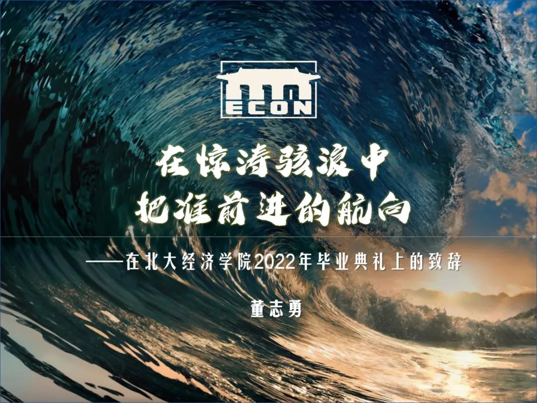 在惊涛骇浪中,希望你们锤炼直面风雨的能力,“不尽狂澜走沧海,一拳天与压潮头”。辛弃疾在诗中写道:“叹人生,不如意事,十常八九。”但是现实的凄风苦雨,不会因为诗人的伤春悲秋而消失;前行的艰难险阻,也不会因为水手的懦弱退缩而让步。作为北大经院的毕业生,你们需要在中国经济这艘大船上不断锤炼自身的能力,在更广袤的历史脉络与时空格局中,与时代同频共振、为改革奉献青春。