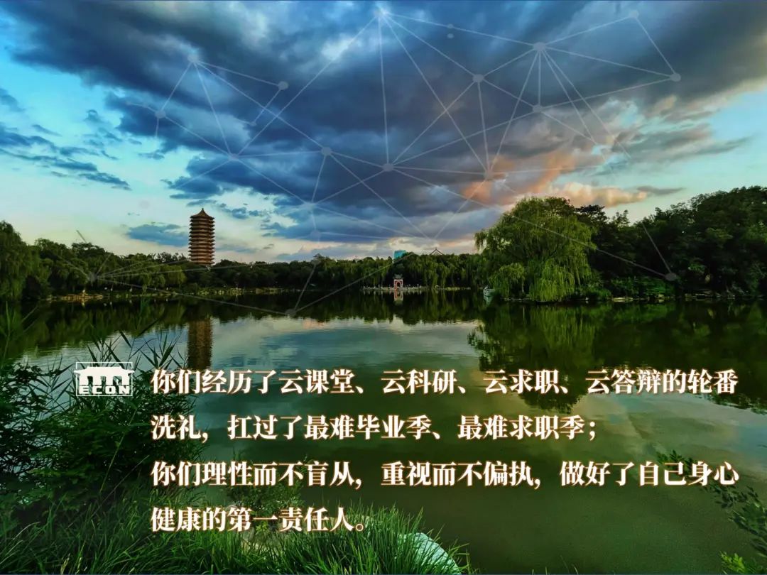 在金秋时节踏入燕园,在盛夏时节告别青春,这似乎是每个学子再寻常不过的回忆。然而突如其来的疫情却打破了这份寻常和宁静,为你们在燕园的大半、甚至全部旅程平添了许多波折和遗憾。但让我感到无比欣慰和感动的是,在座的诸位同学在前所未有的风浪中始终奋勇前进:你们经历了云课堂、云科研、云求职、云答辩的轮番洗礼,扛过了最难毕业季、最难求职季;面对疫情带来的种种困难,你们理性而不盲从,重视而不偏执,做好了自己身心健康的第一责任人;在最近一轮始料未及的疫情中,许多同学还加入到疫情防控的志愿者行列,守护校园、共克时艰,用行动展现了经院学子的昂扬风貌和责任担当。