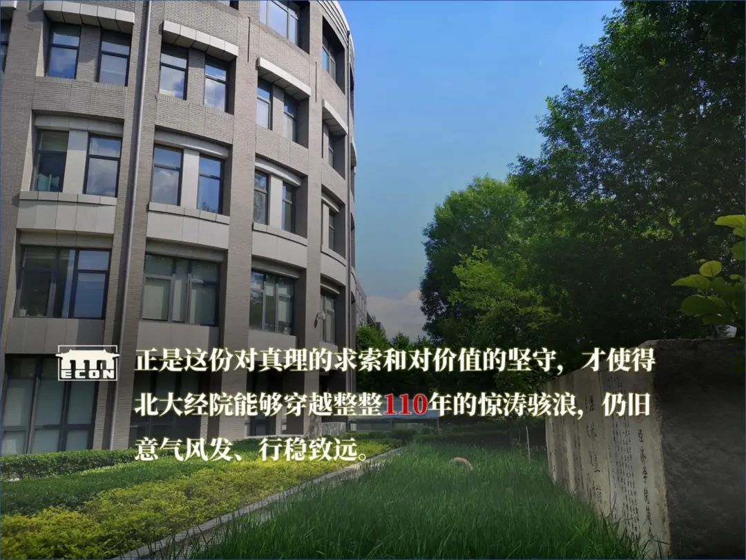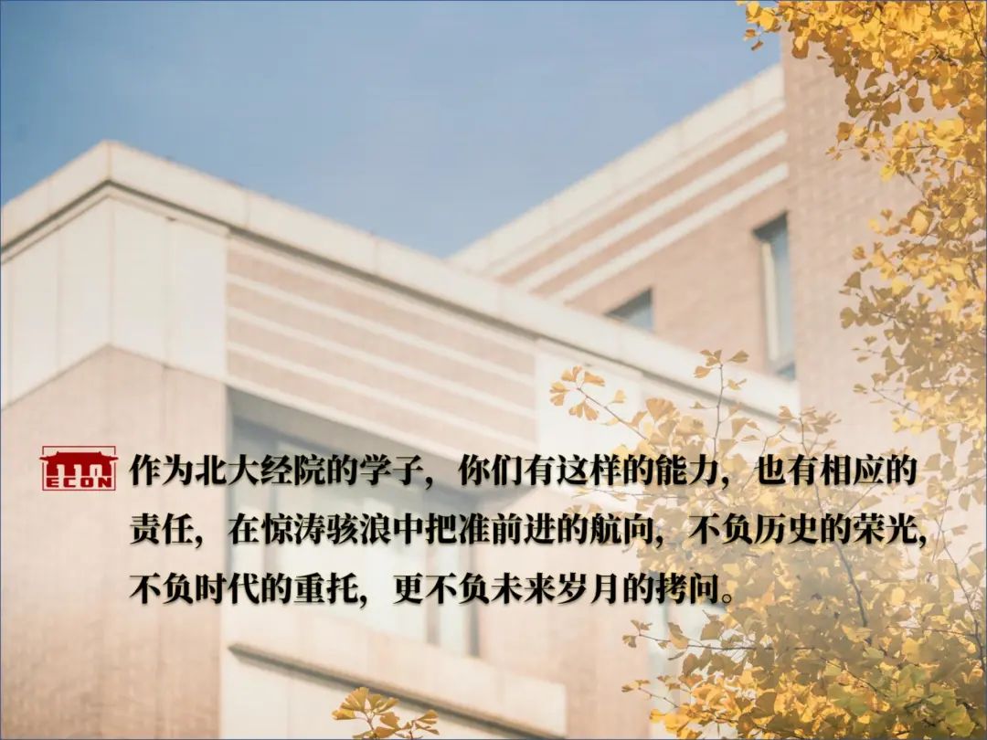 北大经院人向来就有拨云见日、求是维新的传统。我们的前辈,在启蒙声浪中高擎马克思主义大旗,在抗战烽火中坚守书生报国的意气,在改革开放热潮中首倡市场化和股份制改革。正是这份对真理的求索和对价值的坚守,才使得北大经院能够穿越整整110年的惊涛骇浪,仍旧意气风发、行稳致远。多年以后,诸位同学可能早已忘记书本中的经济学理论和模型,但请大家永远记住在第一堂经济学原理课上学到的“理性”,去理解真实世界中的约束条件和博弈规则,做真理的践行者,永远对市场规律怀有敬畏之心;另一方面,也请大家永远记住经济学中无处不在的“道德情操”,对父母朋友怀有感恩之心,对劳苦大众怀有悲悯之心,对公共利益怀有责任之心,对国家民族怀有赤诚之心。