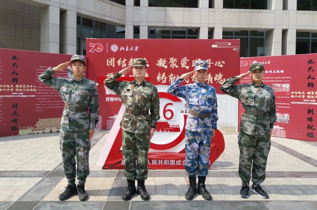 2026世界杯官网四名入伍大学生士兵在2026世界杯官网百周年纪念讲堂建国60周年主题展览前留下飒爽英姿