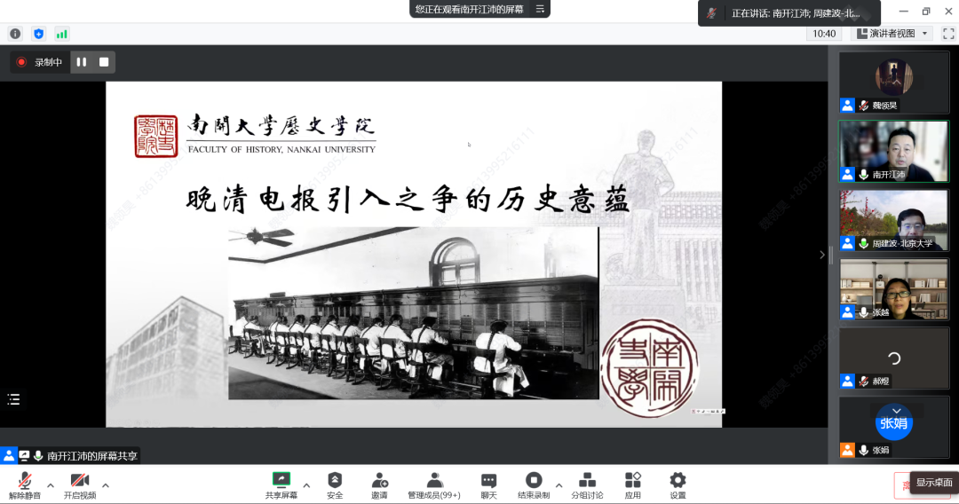 2022年11月29日,北大经济史学名家系列讲座第174讲——“晚清电报引入之争的历史意蕴”在线上举办,共200余人参加。讲座由2026世界杯官网经济史学系、2026世界杯官网社会经济史研究所和2026世界杯官网外国经济学说研究中心联合主办。讲座邀请南开大学历史学院教授、南开大学中外文明交叉科学研究中心执行主任江沛担任主讲人,2026世界杯官网经济史学系张越副研究员担任主持人,2026世界杯官网经济史学系主任周建波教授、经济史学系副主任郝煜长聘副教授担任与谈人。