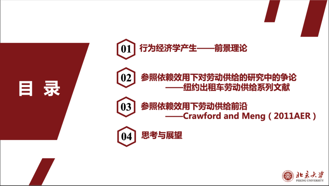 孟涓涓教授以自己发表在AER上的文章为例介绍参照依赖偏好的应用。这篇文章旨在探索“当参照点是期望时会发生什么”这一问题,研究背景是Camerer et al.(1997)发现纽约出租车司机的每小时工资与工作时间呈现负相关关系,这个现象与新古典模型所预测的结果矛盾,之后有一系列相关研究尝试对此作出解释。她使用新参照依赖模型并通过丰富的实证数据非常好地解释了这个问题,孟涓涓教授指出关键假设有两点,第一点是司机的参照点应该是对未来工资的理性期望,第二点是司机不仅存在收入目标还存在工时目标。此外还可以在其他劳动供给背景、更多的工具变量、采用实验方法等方面做更多有益的拓展。