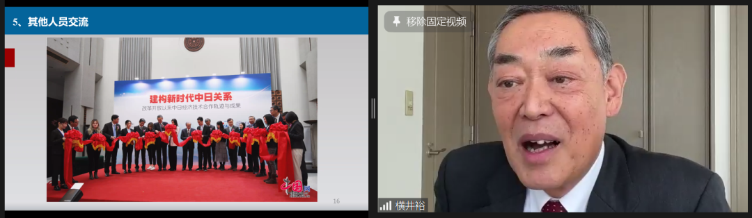 讲座最后,横井裕对中日关系进行了总结和展望。他动情地回忆到,疫情期间,“山川异域,风月同天”反映了中日两国互携互助的友好关系。当前世界正处于大变局时期,需要中国和日本这两个世界第二大经济体和第三大经济体相互合作,继续做出努力。横井裕认为,和平是繁荣的基石,为了维护和平与繁荣,中日两国今后应当进一步加强各领域各层级的密切交流与沟通。