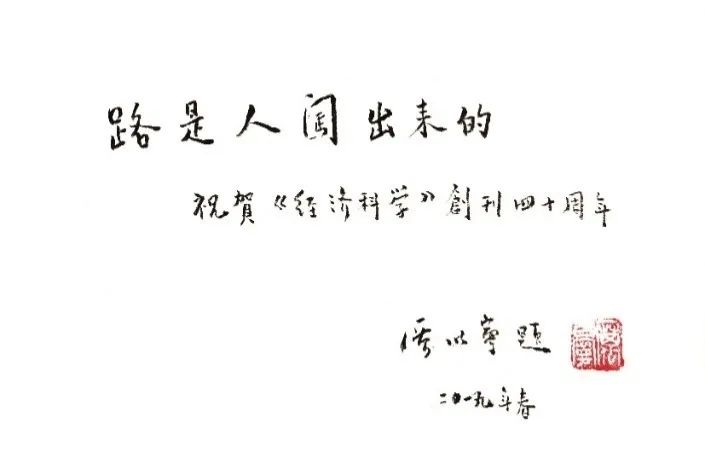 看到这幅题词,我真是特别感动!感动于厉老师对《经济科学》的一贯支持,更感动于89岁高龄的他仍保持着“老骥伏枥志在千里”般积极的人生态度。从“野无人迹非无路,村有溪流必有桥”到“路是人闯出来的”,都可以看到不断探索、一往无前的精神在厉老师的人生字典中占有举足轻重的位置。