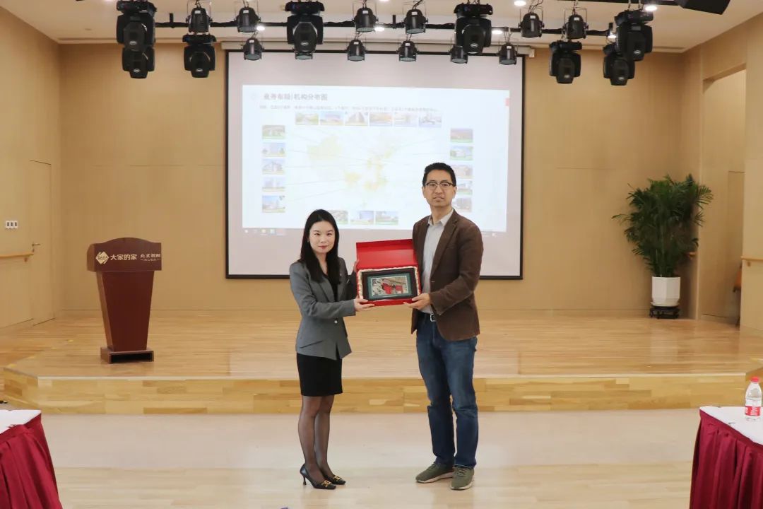 金融保险教师党支部书记陈凯向大家保险养老社区赠送纪念品