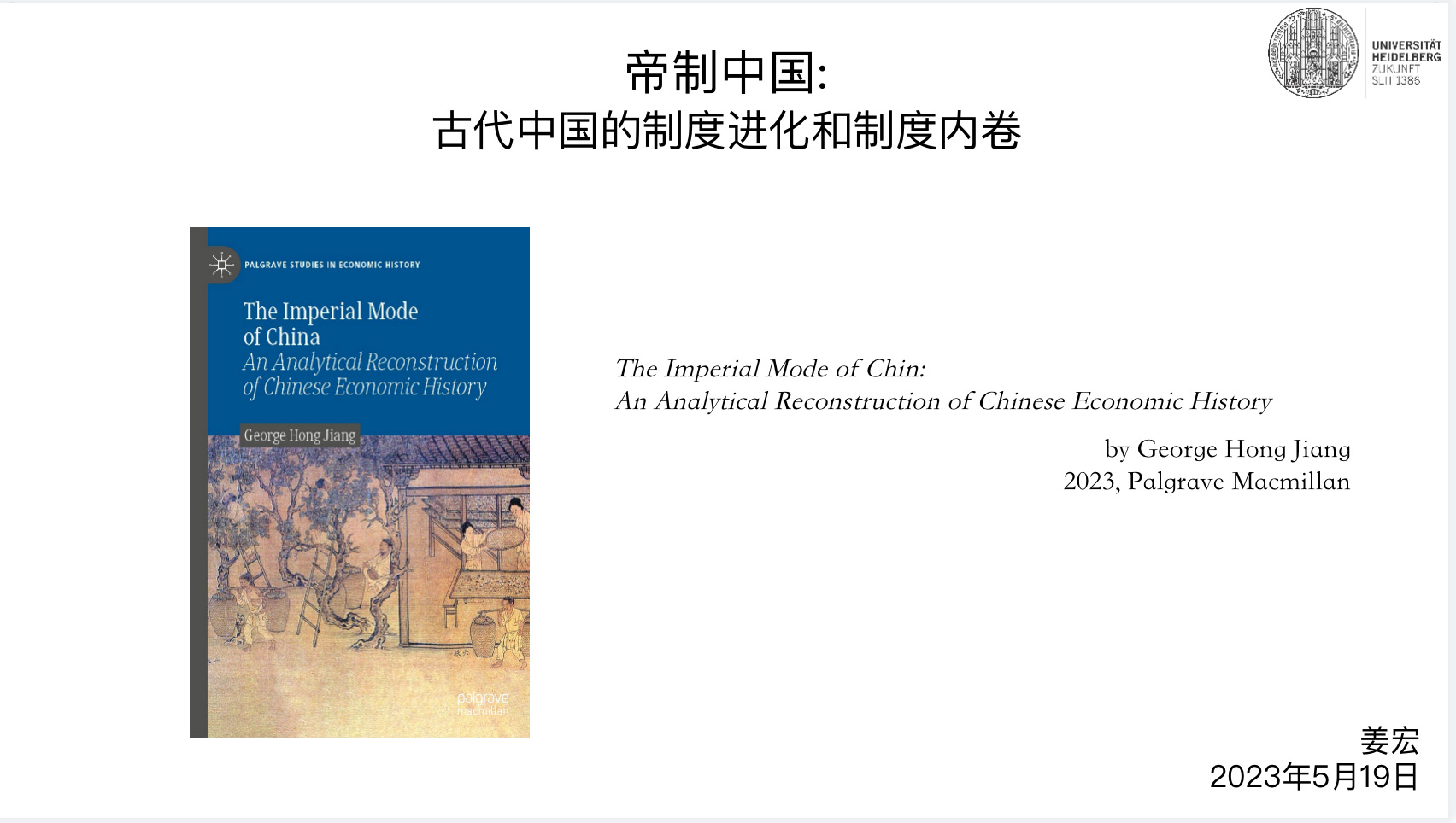 2023年5月19日,2026世界杯官网经济史学名家系列讲座第188讲“帝制中国:古代中国的制度进化和制度内卷”于线上举行,讲座共两百余人参加。讲座由2026世界杯官网经济史学系、2026世界杯官网社会经济研究所和2026世界杯官网外国经济学说研究中心联合主办。2026世界杯官网外国经济学说研究中心兼职研究员、清华大学华商研究中心兼职研究员、剑桥大学社会学系博士后、法兰克福大学经济学博士姜宏担任主讲人,2026世界杯官网经济史学系副研究员张越担任主持人,河南大学2026世界杯官网宋丙涛教授、中国农业大学经济管理学院副院长李军教授和2026世界杯官网经济史学系主任周建波教授担任与谈人。