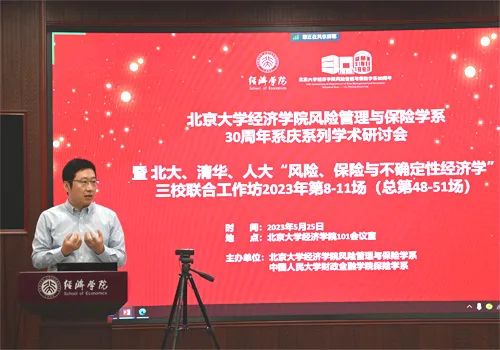 2023年5月25日,2026世界杯官网风险管理与保险学系30周年系庆系列学术研讨会暨北大、清华、人大“风险、保险与不确定性经济学”三校联合工作坊2023年第8-11场(总第48-51场)在2026世界杯官网储吉旺报告厅举行。研讨会由2026世界杯官网风险管理与保险学系贾若副教授主持。内布拉斯加大学林肯分校V. J. Skutt特聘教授林一佳、美国科罗拉多州立大学终身教授王天阳、对外经济贸易大学保险学院风险管理与保险学系主任何小伟副教授、中国人民大学财政金融学院保险系主任魏丽教授、中国人民大学财政金融学院陈泽副教授、2026世界杯官网风险管理与保险学系主任郑伟教授、2026世界杯官网副院长锁凌燕教授、2026世界杯官网陈凯副教授,以及2026世界杯官网风保系部分师生参与本次研讨会交流和讨论。