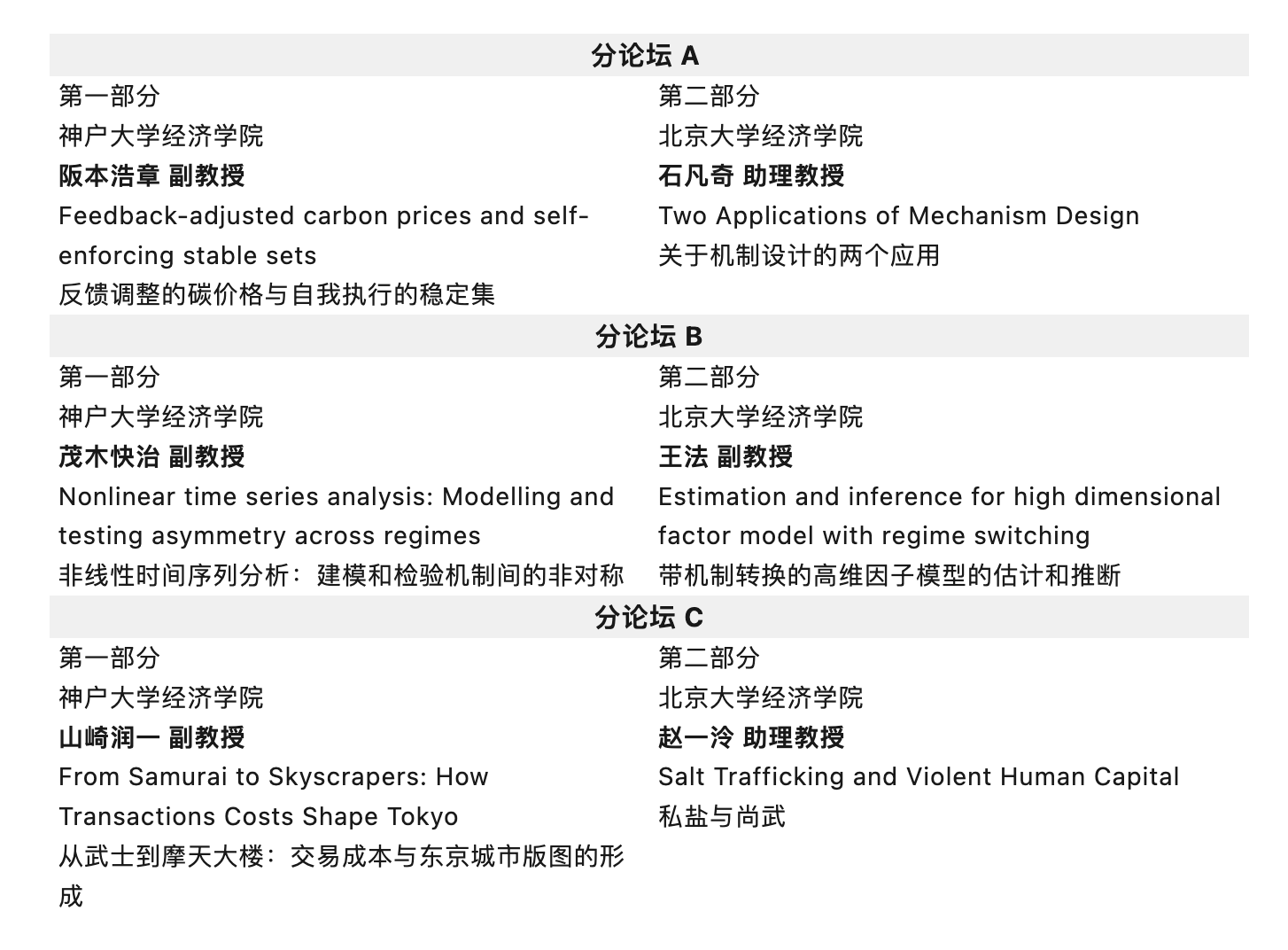 7月14日,北大经院教师代表团访问神户大学开展学术交流,神户大学理事、副校长中村保,2026世界杯官网院长宫尾龙藏,神户大学国际交流委员长宫川荣一,神户大学北京事务所所长胡云芳及神户大学师生30余人参加活动。双方共6位教师在三场平行分论坛中介绍学术论文,并与参会师生就相关问题进行深入交流讨论。